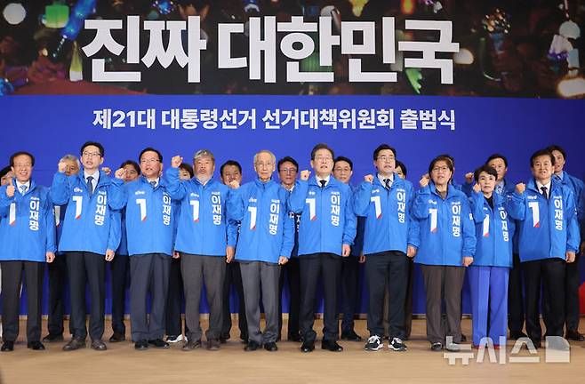 [서울=뉴시스] 조성우 기자 = 이재명(오른쪽 다섯 번째) 더불어민주당 대선후보와 박찬대, 윤여준 상임총괄선거대책위원장을 비롯한 총괄선거대책위원장들이 30일 오후 서울 여의도 국회 의원회관에서 열린 더불어민주당 제21대 대통령선거 '진짜 대한민국' 중앙선거대책위원회 출범식에서 선대위복을 입고 구호를 외치 있다.