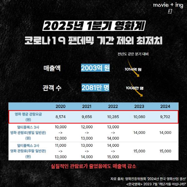저렴한 관람료가 관객 유입으로 이어지진 않았다. 올해 1분기 영화 매출액은 2003억 원, 관객 수는 2081만 명이다. 이는 전년 같은 기간에 견줘 각각 1014억 원, 1008만 명 감소한 수치다. 코로나19 팬데믹 기간을 제외하면 최저치다.