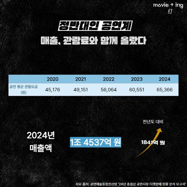 반면 영화와 달리 공연 산업은 티켓 가격 인상과 함께 매출이 증가하고 있다. 공연예술통합전산망의 ‘2024년 총결산 공연시장 티켓 판매 현황 분석 보고서’를 보면 지난해 공연 평균 관람 요금은 6만5366원으로, 전년보다 4815원 올랐다. 티켓 판매액 역시 1조4537억 원으로, 1841억 원 늘었다.