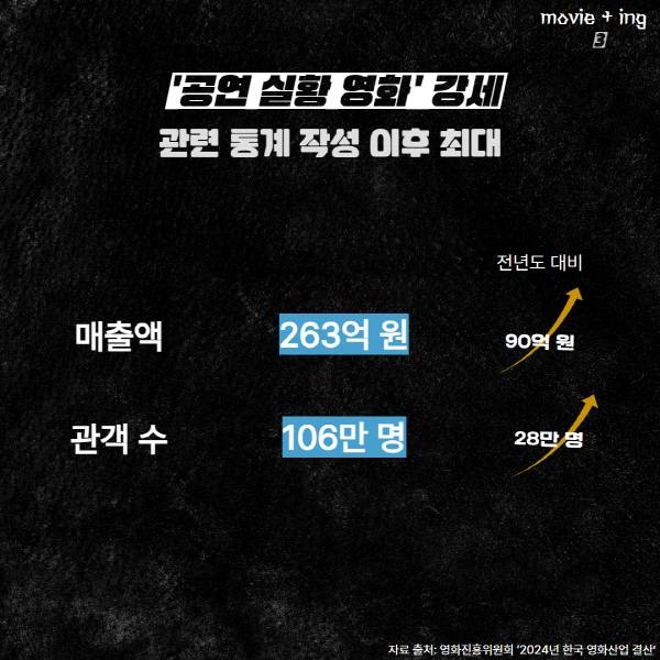 공연 산업의 강세는 극장가에도 영향을 미친다. ‘공연 실황 영화’ 장르는 지난해 매출 263억 원, 관객 수 106만 명을 기록하며 각각 1년 전보다 90억 원, 28만 명이 증가했다. 관련 통계 작성 이후 최대치다.