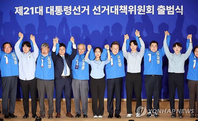 (서울=연합뉴스) 박동주 기자 = 30일 서울 여의도 국회 의원회관에서 열린 더불어민주당 제21대 대통령선거 '진짜 대한민국' 중앙선거대책위원회 출범식에서 이재명 대선 후보, 윤여준·박찬대 상임 총괄선대위원장 등 참석자들이 기념촬영을 하고 있다. 2025.4.30