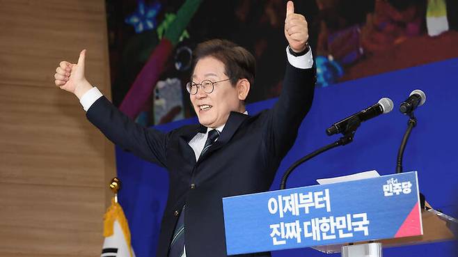 ▲ 더불어민주당 이재명 대선 후보가 30일 서울 여의도 국회 의원회관에서 열린 더불어민주당 제21대 대통령선거 '진짜 대한민국' 중앙선거대책위원회 출범식에서 엄지를 들어 보이며 미소 짓고 있다.