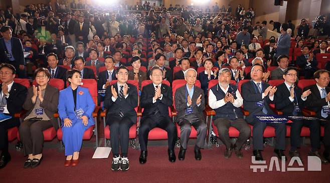 [서울=뉴시스] 조성우 기자 = 이재명(왼쪽 다섯 번째) 더불어민주당 대선후보와 박찬대, 윤여준 상임총괄선거대책위원장을 비롯한 선대위원장들이 30일 오후 서울 여의도 국회 의원회관에서 열린 더불어민주당 제21대 대통령선거 '진짜 대한민국' 중앙선거대책위원회 출범식에서 박수치고 있다.