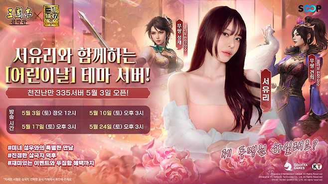 특별한 즐거움도 마련됐다. 삼국지 마니아로 잘 알려진 성우 서유리가 [어린이날] 테마 서버 ‘천진난만 335서버’에 직접 참여해, 이용자들과 함께 삼국 전장을 누빌 예정이다. 5월3일부터 진행되는 라이브 방송에서는 '삼국 여장수 목소리 퀴즈', '무쌍 컬래버 3탄 퀴즈' 등 다양한 이벤트가 마련되며, 참가자에게는 치킨 쿠폰과 구글 기프트 카드 등 푸짐한 선물이 제공된다.