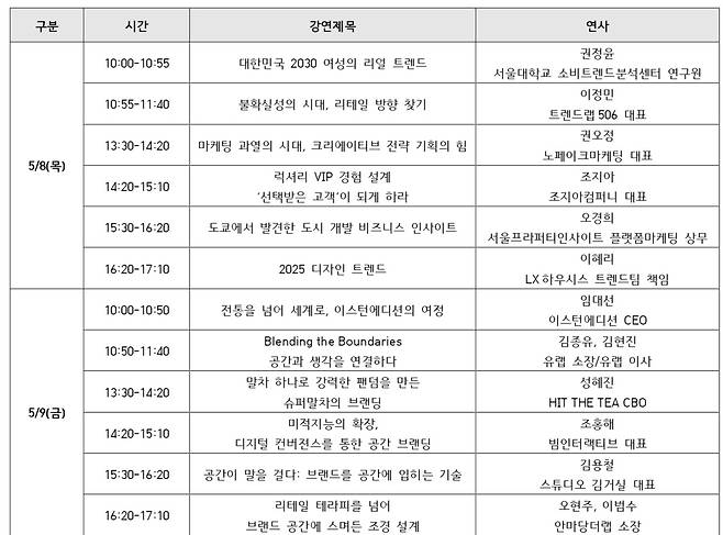 앞서 언급된 연사 외에도 패션과 뷰티, F&B, 전자 등 다양한 산업을 넘나들며 브랜드 전략과 트렌드 발굴 워크샵 프로그램을 운영하는 ‘트렌드랩506’의 이정민 대표와 ‘메밀단편’, ‘교촌치킨’을 비롯해 다양한 리테일 공간 디자인을 선보인 ‘스튜디오 김거실’의 김용철 대표 등 다채로운 경력과 경험을 쌓은 브랜드 마케팅 전략과 리테일 공간 디자인 전문가들이 강연을 준비해 많은 소비자들과 업계 종사자들의 기대를 모으고 있다.