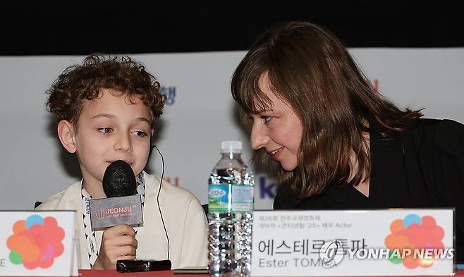 (전주=연합뉴스) 나보배 기자 = 제26회 전주국제영화제 개막일인 30일, 전북 전주시 완산구 전주디지털독립영화관에서 열린 콘티넨탈 '25 개막작 기자회견에서 베네데크 미클로시 터나세 배우(왼쪽)가 기자들의 질문에 답하고 있다. 2025.4.30