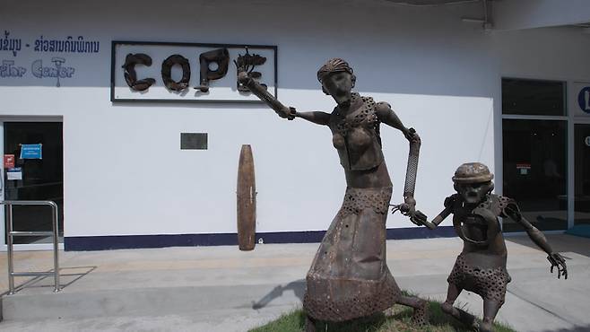 | ▲ 라오스 불발탄 피해자를 지원하는 COPE 불발탄으로 만든 조각상이 서 있다. |