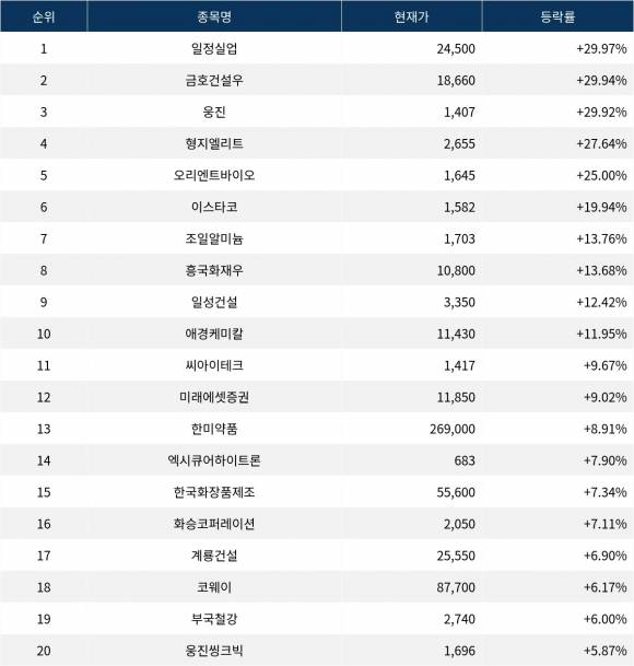 6위 이스타코(015020)는 종가 1,582원으로 +19.94% 급등 마감했다. 7위 조일알미늄(018470)은 종가 1,703원으로 +13.76% 급등 마감했다. 8위 흥국화재우(000545)는 종가 10,800원으로 +13.68% 급등 마감했다. 9위 일성건설(013360)은 종가 3,350원으로 +12.42% 급등 마감했다. 10위 애경케미칼(161000)은 종가 11,430원으로 +11.95% 급등 마감했다.