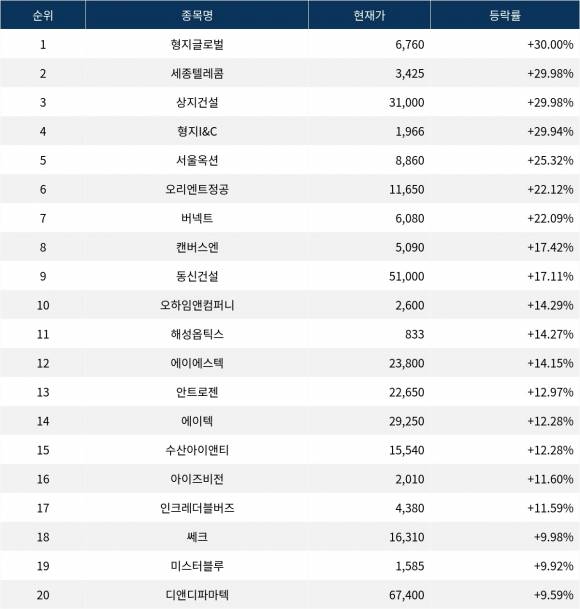 6위 오리엔트정공(065500)은 종가 11,650원으로 22.12% 상승 마감했다. 7위 버넥트(438700)는 종가 6,080원으로 22.09% 상승 마감했다. 8위 캔버스엔(210120)은 종가 5,090원으로 17.42% 상승 마감했다. 9위 동신건설(025950)은 종가 51,000원으로 17.11% 상승 마감했다. 10위 오하임앤컴퍼니(309930)는 종가 2,600원으로 14.29% 상승 마감했다.