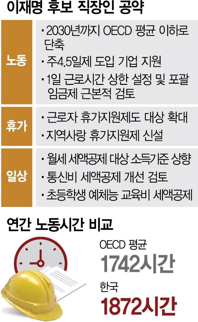 이재명 더불어민주당 대선 후보가 선거대책위원회 구성 이후 첫 공약으로 ‘노동시간 단축’을 꺼내들었다. 2030년까지 연간 노동시간을 경제협력개발기구(OECD) 평균 이하로 낮추고 주4.5일 근무제를 도입한 기업을 지원하겠다는 게 골자다. 지난 대선과 올 초 교섭단체 대표연설에서도 언급했던 주4일제도 장기적 목표로 내걸었다. ‘우클릭’을 전면에 내세웠던 이 후보가 직장인 표심을 잡기 위해 ‘친노동’으로 다시 노선 전환에 나선 게 아니냐는 목소리가 나온다.