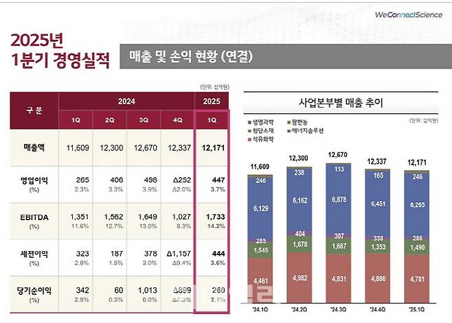 [이데일리 하지나 기자] LG화학이 한 분기 만에 흑자 전환에 성공했다. 석유화학 사업의 적자폭 축소와 전자소재 및 엔지니어링 소재 등 고부가 제품 매출 확대가 실적 개선을 견인한 것으로 분석된다. 다만, 회사는 향후 전망에 있어 미국의 관세 정책과 고객사 재고 축소 기조 등을 이유로 보수적인 입장을 유지했다.