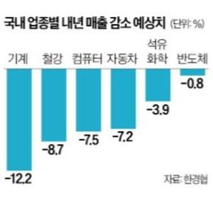중국은 철강·금속(-11.7%) 기계·산업장비(-8.3%) 바이오·생활소비재·의류(-7.5%) 순으로 타격이 클 것으로 예상됐고, 일본은 철강·금속(-10.5%) 반도체·전자제품(-10.4%) 자동차·부품(-7.6%) 컴퓨터·관련 장비(-6.3%) 순이었다. 한국은 기계·산업장비(-12.2%) 철강·금속(-8.7%) 컴퓨터·관련 장비(-7.5%) 자동차·부품(-7.2%) 업종이 가장 큰 타격을 받을 것으로 조사됐다.