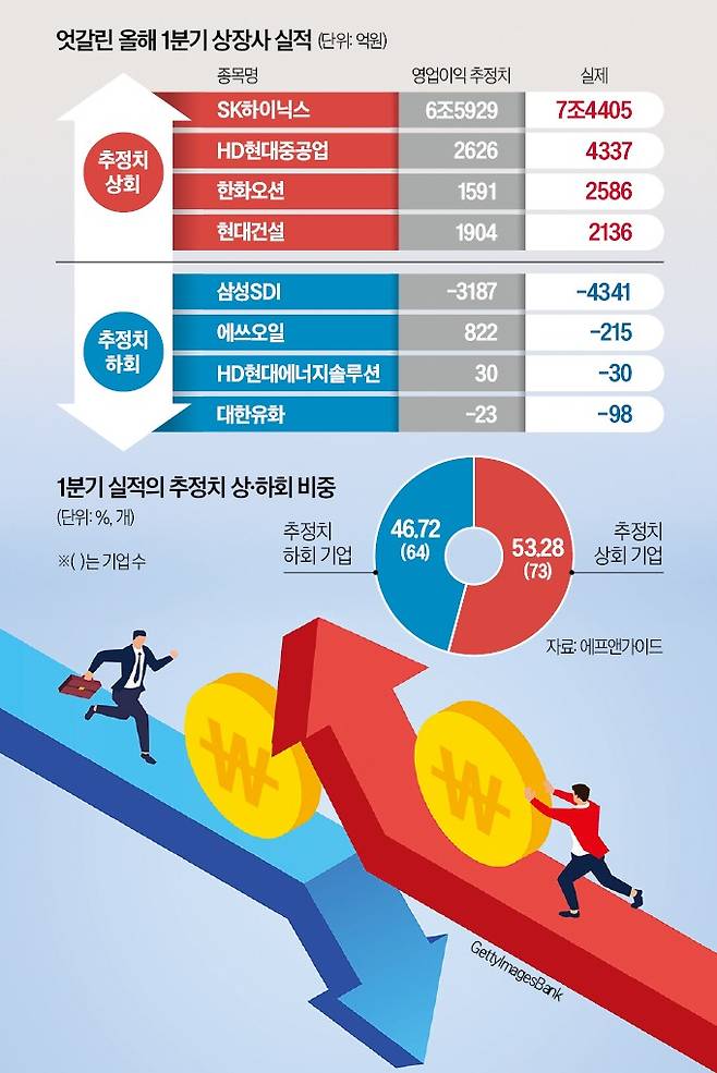 금융정보업체 에프앤가이드에 따르면 증권사들이 실적 컨센서스(추정치)를 낸 상장사 중 이날까지 1분기 잠정 실적을 발표한 회사는 총 137곳이다. 이 중 적자 축소와 흑자 전환을 포함해 73개(53.28%) 기업이 추정치를 웃도는 영업이익을 발표했다. 전체의 35.76%인 49개 기업은 추정치 대비 영업이익이 10% 이상 많은 ‘어닝 서프라이즈’(깜짝 실적)를 기록했다. 반대로 실적 충격을 기록한 기업은 40개(29.19%)였다.