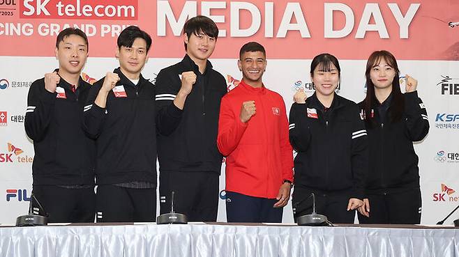 ▲ 30일 서울 송파구 올림픽파크텔에서 열린 '2025 서울 SK텔레콤 국제그랑프리' 미디어데이에서 오상욱을 비롯한 선수들이 포즈를 취하고 있다. 왼쪽부터 박상원, 구본길, 오상욱, 파레스 페르자니, 전하영, 최세빈