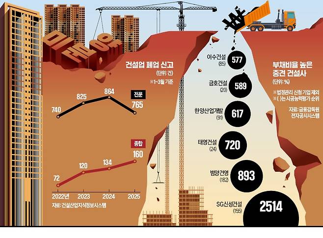 작년 말 기준 중견 건설사 4곳 중 1곳의 부채비율이 200%를 초과했거나 자본잠식 상태에 빠져 있다. 사업·감사보고서를 공시한 185개 회사 중 51곳(27.6%)이 여기에 해당한다. SG신성건설의 부채비율은 2514%나 된다. 삼정기업, 삼정이앤시, 이화공영 등 올해 법정관리 길을 걷게 된 회사의 부채비율(작년 말 기준)은 모두 200%대다. 나이스신용평가는 최근 펴낸 보고서에서 영업적자를 내고 부채비율이 400%를 웃도는 부실 징후 건설사를 작년보다 4곳 늘어난 15곳으로 제시했다.