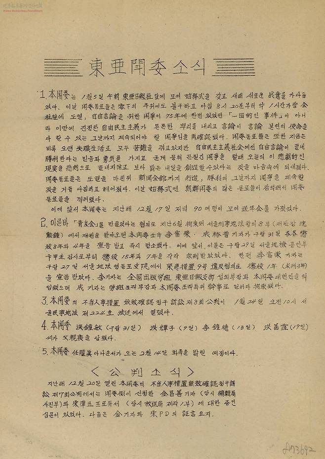 동아투위 유인물 ‘동아투위소식’이 없었다면 안종필 평전은 한걸음도 나가지 못했을 것이다. 동아일보에서 쫓겨난 이후 안종필과 동료들은 동아투위 활동 상황과 성명서 등을 담은 ‘동아투위소식’을 매주 발간해 길거리에서 배포했다. 시대의 파노라마가 손으로 꾹꾹 눌러 쓴 유인물에 펼쳐져 있었다. 안종필 평전을 쓰는 원동력이자 위안이었고, 그 자체가 감동이었다. 그 기록의 힘을 따라 여기까지 왔다.