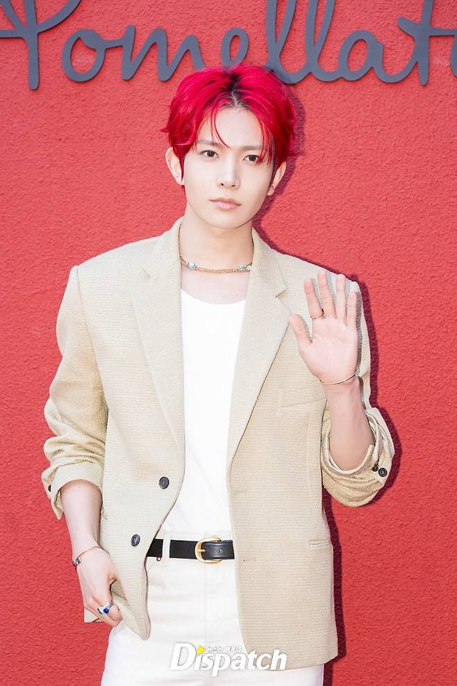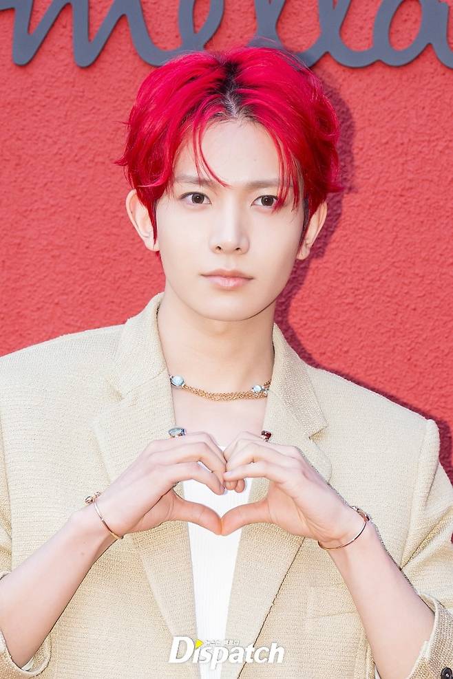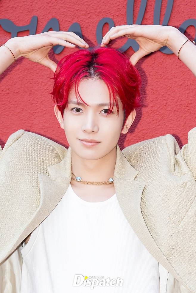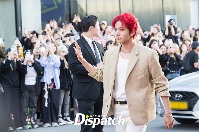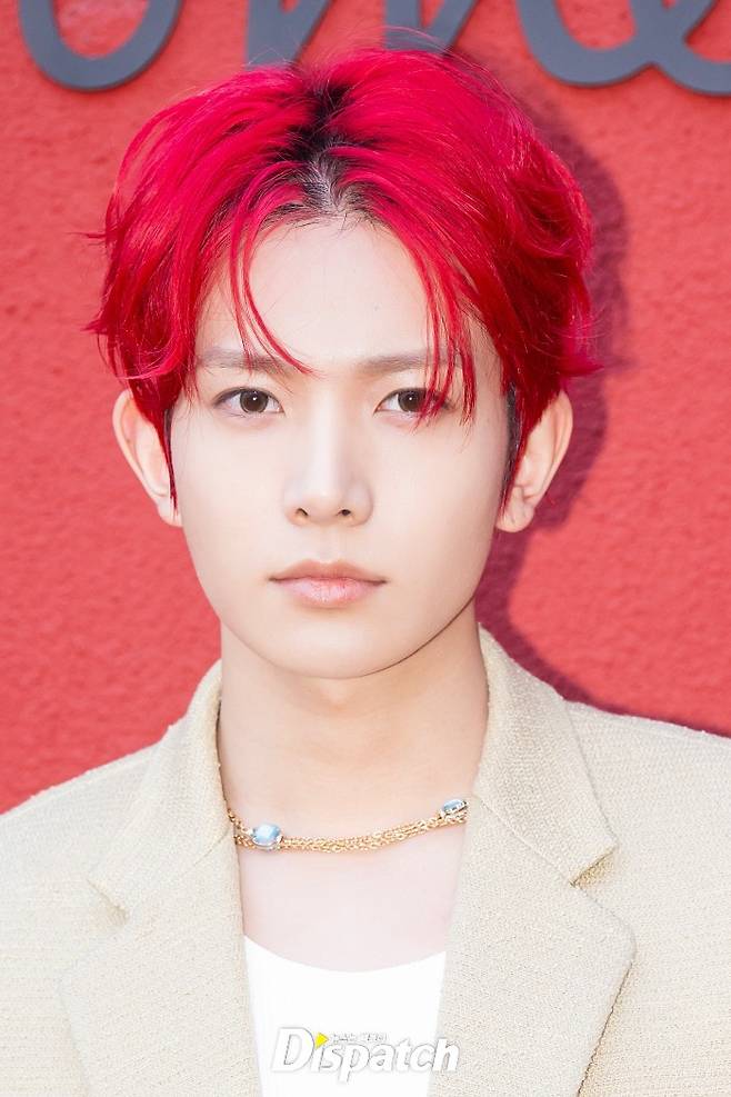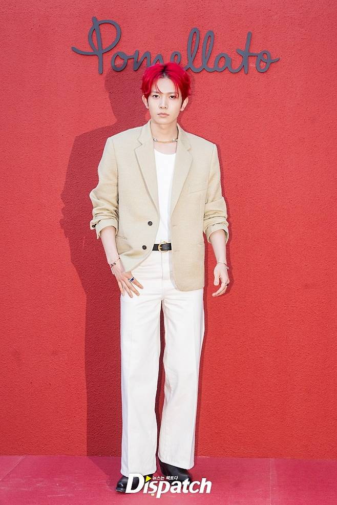 희승은 베이지 재킷과 화이트 팬츠로 멋을 냈다. 새빨간 헤어스타일이 시선을 사로잡았다.
