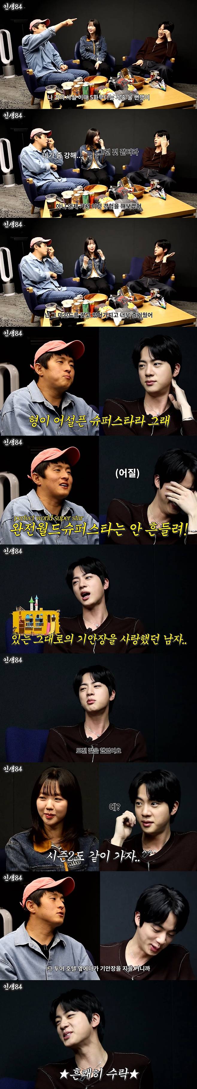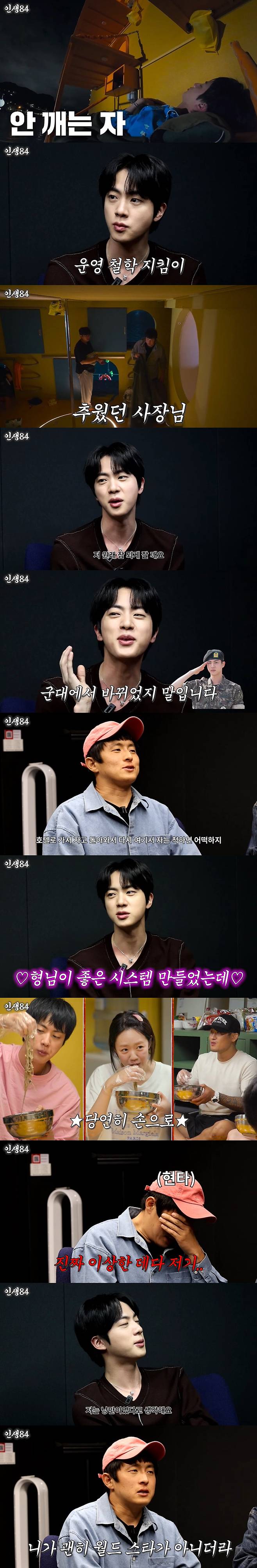 이어 기안84는 "직원들이 와서 힘든 걸 보고 싶었다. 근데 나도 힘들더라. 5화부터는 계속 울 뻔했다"고 털어놨다. 그러나 진은 "나는 너무 재밌었다. 언제 가서 이런 경험을 해보겠나. 나는 그 마인드를 갖고 있어서 너무 즐거웠다"고 했다. 이에 기안84는 "확실히 월드스타는 다르다"며 "내가 계속 걱정되고 흔들리고 할 때마다 진이 '형이 어설픈 슈퍼스타라 그래. 나 같은 완전 월드슈퍼스타는 안 흔들린다'고 하더라"고 말해 진을 당황하게 만들었다.