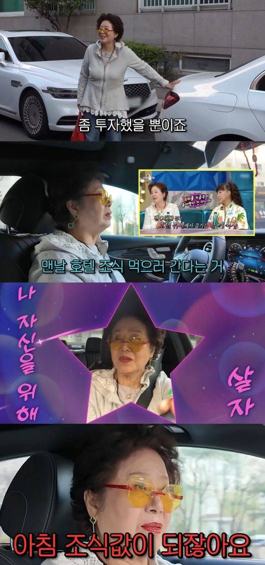 선우용여는 "남편이 있을 땐 가족들 밥을 해줘야 했다. 다 같이 호텔에 가기엔 너무 비싸다. 근데 남편도 돌아가시고 아이들도 시집 장가가고 그럼 나 자신을 위해 살아야 한다"고 말했다.