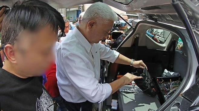 ▲ 29일(현지시간) 필리핀 수도 마닐라 선관위 사무실 근처에서 수사 당국이 중국인(왼쪽)을 체포하고 차량 내 휴대전화 도청 장비 등을 살펴보고 있다.