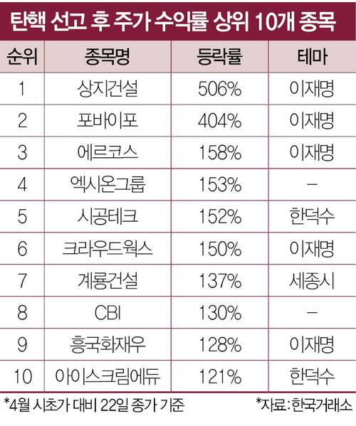 한국거래소에 따르면, 윤석열 전 대통령 탄핵 선고일이었던 지난 4월 4일부터 22일까지 코스피·코스닥 주가 상승률 상위 10개 종목 가운데 8개가 정치테마주로 나타났다. ▲상지건설(주가 등락률 505.8%) ▲포바이포(404.4%) ▲에르코스(158.3%) ▲시공테크(151.6%) ▲크라우드웍스(150.5%) ▲계룡건설(137.1%) ▲흥국화재우(127.7%) ▲아이스크림에듀(121.5%) 등으로 조사됐다.