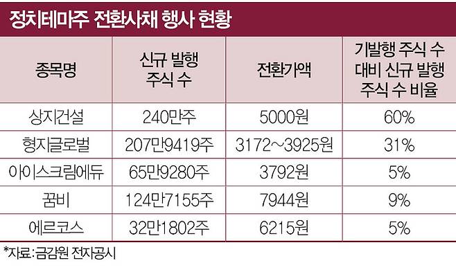 테마주 투기 열기에 편승해 전환사채(CB)를 주식으로 전환하는 사례도 속출한다. 금감원 전자공시에 따르면, 지난 4월 4일부터 23일까지 나온 전환청구권행사 공시 25건 가운데 11건이 정치테마주 관련 기업에서 나왔다. 주가가 이상 급등하자 CB를 주식으로 전환해 일제히 차익 실현에 나선 것. 테마주에 올라탄 투자자는 ‘물량 폭탄’을 고스란히 떠안을 처지다.
