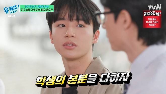 그런 가운데 유재석은 "'검은 수녀들' 다음 날이 중3 기말고사였는데, 반에서 1등, 전교 8등을 했다던데"라고 놀랐다. 문우진은 "사람이라 졸리긴 했는데, 정신력으로 버텼다. 연기 연습은 미리 끝내고, 대기 시간을 활용해서 공부했다"라고 열심히 노력했다고 전했다. 문우진은 "부모님은 적당히만 해도 된다고 하셨는데, 배우이기 전에 학생이니까 본분을 다하자고 생각했다"라며 "시험 잘 볼 때 터지는 도파민이 있는데 그게 너무 좋다"라고 공부를 열심히 하는 이유를 밝혔다.