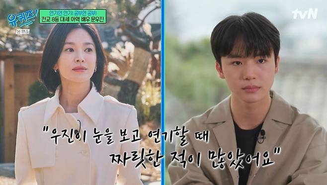 영화 '검은 수녀들'에선 악령에 사로집한 소년을 연기한 문우진. 이를 두고 송혜교는 "우진이 눈을 보고 연기할 땐 짜릿한 적이 많았다"고 했다. 문우진은 "너무 감사하다. 그 말씀을 현장에서도 많이 해주셨다. 눈빛이 너무 좋고, 짜릿하다고. 그 얘기를 듣고 더 힘내서 촬영할 수 있었다"고 고마운 마음을 전했다.