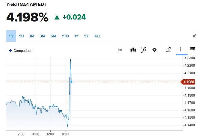 [뉴욕=이데일리 김상윤 특파원] 미국의 1분기 경제성장률이 예상보다 크게 위축됐다는 소식에 뉴욕증시 3대지수 선물은 하락하고, 국채금리는 치솟고 있다. 경제는 위축되면서 물가는 상승하는 스태그플레이션 우려가 다시 나오고 있다.