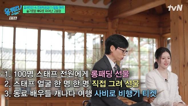 고윤정은 '언슬전' 100명 전원에게 롱패딩을 선물하고, 촬영 마지막 날 스태프 얼굴 한 명씩 직접 그려서 선물했다고. 또한 동료배우들 위해서 사비로 비행기 티켓을 끊어서 캐나다 여행을 갔다는 고윤정은 "롱패딩 선물은 제가 광고하는 브랜드에서 도와주셔서 선물할 수 있게 된 거다"라고 밝혔다. 스태프 그림 선물에 대해선 "어떻게 하면 애틋했다는 걸 진심으로 표현할 수 있을까 하다가 할 줄 아는 게 그림밖에 없어서 그림을 그렸다"라고 겸손하게 말했다.