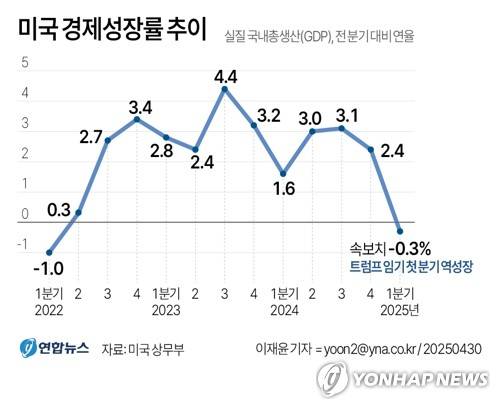 미 상무부는 1분기 미국의 국내총생산(GDP) 증감률(속보치)이 -0.3%(직전분기 대비 연율)로 집계됐다고 30일(현지시간) 밝혔다. 미국 경제가 분기 기준으로 역성장한 것은 지난 2022년 1분기(-1.0%) 이후 3년 만이다.