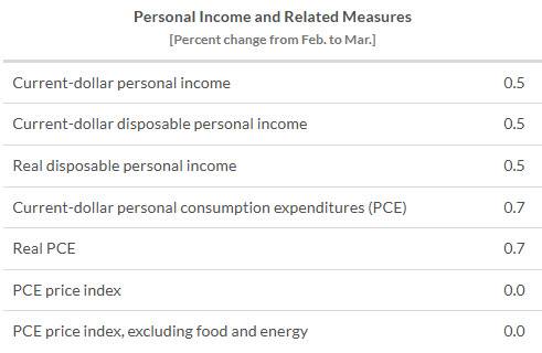 미 상무부 경제분석국(BEA)에 따르면 3월 개인소비지출(PCE) 물가지수는 2월 대비 보합을 기록했다. 전년동월대비로는 2.3% 올랐다. 시장 예상치 (0.0%, 2.2%)에 거의 부합했다. 이는 지난해 9월(2.1%) 이후 가장 낮은 수치다.