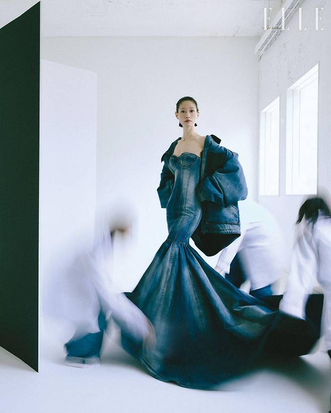 오버사이즈 데님 재킷과 머메이드 실루엣의 데님 드레스는 가격 미정, 모두 Juun. J.