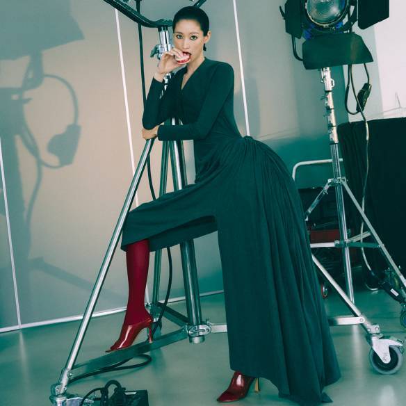 드레이핑을 강조한 드레스는 가격 미정, Pushbutton. 버건디 힐은 가격 미정, Bottega Veneta.