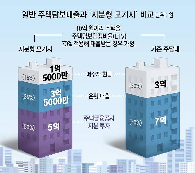 지금은 10억 원짜리 집을 사려면 매수자는 주택담보인정비율(LTV) 70%를 적용해 7억 원을 은행에서 빌리고 3억 원은 현금으로 마련해야 했다. 하지만 주금공이 5억 원을 투자한다면 매수자는 나머지 5억 원만 마련하면 된다. 은행 대출도 받는다면 현금 1억5000만 원으로도 내 집 마련이 가능해지는 것이다. 이후 지분을 늘려갈 수도 있다.