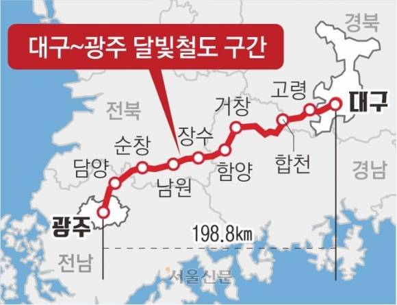 달빛철도는 광주와 대구를 잇는 한반도 동서 횡단 철도로 총연장 198.8㎞다. 달빛철도는 광주를 출발해 유일하게 전남에서는 담양을 지나 전북 순창·남원·장수를 거쳐 경남과 경북 대구까지 6개 광역시도와 10개 시군구를 경유한다. 달빛철도에 연관된 영호남 지역민은 1800만명에 달한다.