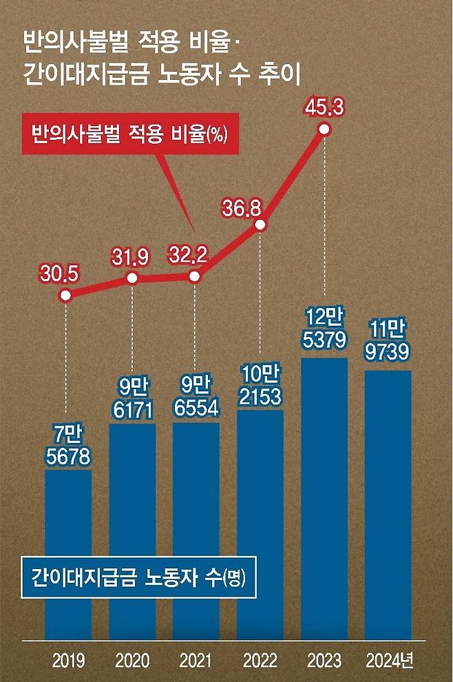 이에 따라 간이대지급금을 받은 노동자 수는 2019년 7만5678명에서 지난해 11만9739명으로 급증했다. 전체 체불 노동자 가운데 비중 역시 2019년 21.9%에서 지난해 42.3%로 크게 늘었다. 간이대지급금 지급 액수도 2019년 2911억원에서 지난해 6694억원으로 두배 이상 늘었고, 체불액에서 차지하는 비중도 32.7%에 이른다. 대지급금 지급이 늘어나는 사이 임금체불 노동부 신고 사건이 사업주 형사처벌로 이어지지 않고 ‘반의사불벌’로 종결되는 비율 역시, 2019년 30.5%에서 2023년 45.3%로 급증했다. 보고서는 “2021년 간이대지급금 지원절차 간소화 이후 반의사불벌죄 적용 비율이 유의미하게 상승했다”며 “간이대지급금 제도가 쉽게 이용 가능해져 피해자들이 신속하게 금전적으로 보상을 받고 사업주에 대한 형사처벌을 포기하는 사례가 늘어났기 때문”이라고 해석했다.