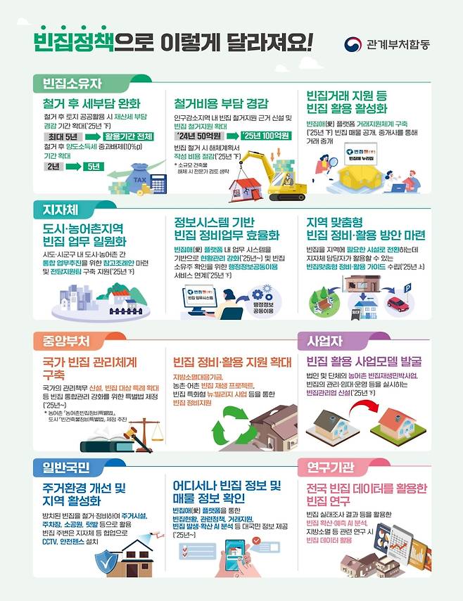 2025년까지 정비지원 예산도 두 배로 확대해 1,500호 철거를 지원하고, 지자체 전담부서 운영과 공무원 매뉴얼 제작 등 실무 기반도 단계적으로 갖춰가고 있습니다.