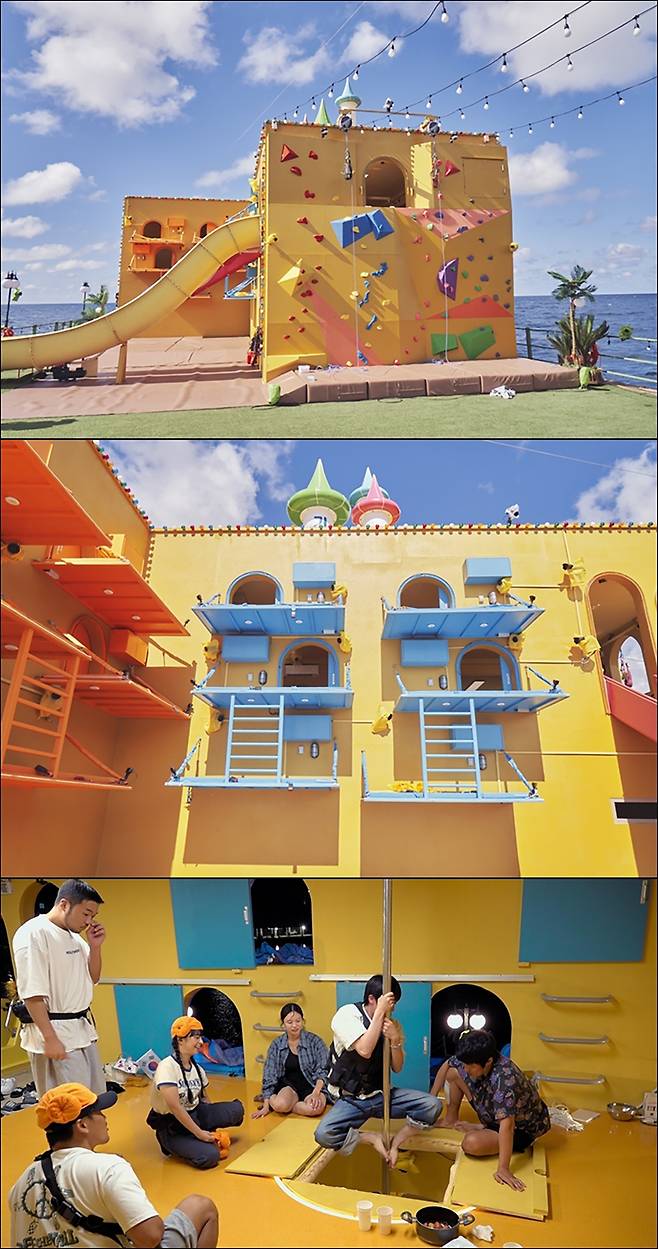 기안장은 멀리서 보면 알록달록한 색깔이 꼭 놀이동산 같은 외형이다. 큰 기대를 안고 기안장 바지선 위에 발을 내디디면, 바로 당혹감이 찾아온다. 민박집 안에 들어갈 문이 1층에 보이지 않기 때문이다. 숙박객을 반기는 건 3.8m 위에 뚫린 출입문으로, 내부로 들어가기 위해선 출입문까지 클라이밍을 해서 올라가야 한다. 매번 들어갈 때마다 암벽을 타야 하니 환장할 노릇이다. 반면 안에서 밖으로 나올 땐 미끄럼틀을 타고 내려온다. 미끄럼틀 중 하나는 바다로 이어져 있어, 집 내부에서 곧장 바다로 풍덩 빠질 수 있다. 천연 워터파크인 셈이다.