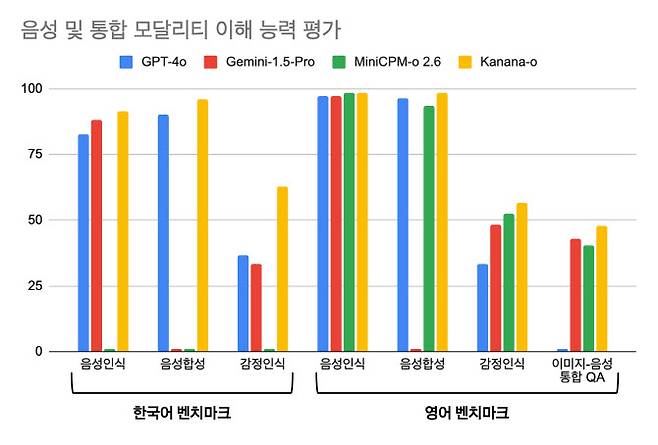 Kanana-o는 한국어 및 영어 벤치마크 테스트에서 글로벌 최고 수준의 성능을 기록했으며, 특히 감정인식 분야에서는 영어·한국어 모두에서 압도적인 성능을 보였다. 이미지와 음성을 종합적으로 이해하는 이미지-음성 질의응답(QA) 태스크에서도 탁월한 성능을 입증했다.