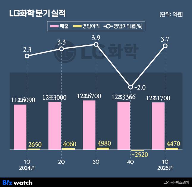 LG화학은 지난달 30일 올해 1분기 12조1710억원의 매출을 올렸다고 공시했다. 이 기간 영업이익은 4470억원을 기록했다. 지난해 4분기 2520억원의 영업손실을 내며 2019년 이후 5년여 만에 적자를 냈었는데, 1개 분기만에 탈출한 셈이다.