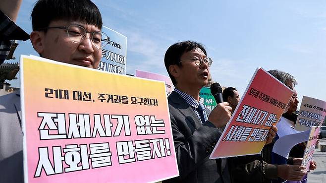 ▲ 주거권네트워크, 전세사기·깡통전세 피해자 전국대책위원회 등에 참여하고 있는 시민사회단체 회원들이 지난달 30일 서울 광화문 월대 앞에서 주거권 관련 21대 대선 정책 요구안 발표 기자회견을 하고 있다.
