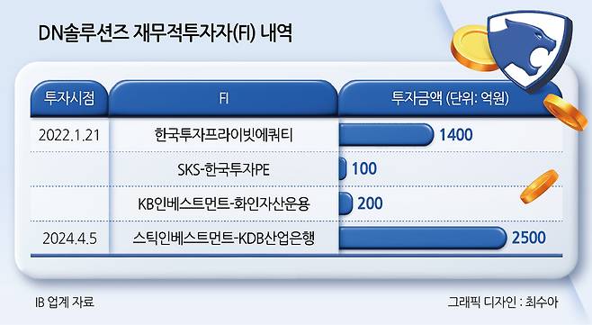 DN솔루션즈가 FI로부터 유치한 누적 투자액은 4100억원이다. 주요 투자자는 ▷한국투자프라이빗에쿼티 ▷SKS프라이빗에쿼티-한투PE ▷KB인베스트먼트-화인자산운용 ▷스틱인베스트먼트-KDB산업은행 등이다. 스틱을 제외한 나머지 FI는 올해 IPO로 엑시트를 기대하며 DN솔루션즈에 투자했으며 이번에 보유 지분을 모두 정리할 계획이었다.