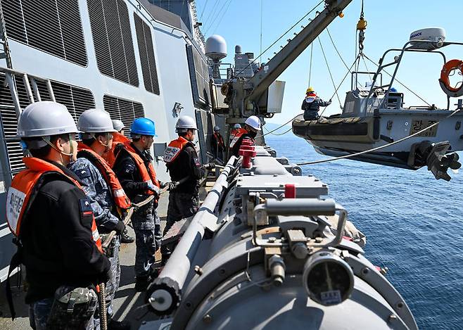 [서울=뉴시스] 강종민 기자 = 해군3함대 광주함(FFG-Ⅰ, 2500톤)이 지난달 29일 남해상에서 합동 해양차단작전을 위해 고속단정(RIB)을 강하하고 있다.