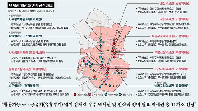 이에 따라, 인천지하철 1호선 인천시청역·부평구청역·부평시장역·계산역·작전역·문학경기장역, 인천 2호선 서구청역·석남역·시민공원역·남동구청역, 수인선 송도역 등 인천 시내 11개 역세권을 활성화 구역으로 선정했습니다.