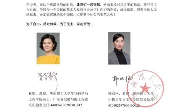 타이완 중앙통신사(CNA) 등 중화권 매체에 따르면, 최근 인터넷에서는 ‘작은 불씨가 들판을 태울 수 있다’는 제목의 선언문이 퍼졌습니다. 선언문은 중국 광둥성 광저우시 화난이공대학 린잉(63) 생물과학·공학 대학 학장과 같은 단과대 한솽옌(49) 교수가 쓴 것으로 돼 있습니다. 뒷부분에는 두 여교수의 사진과 서명, 신분증 번호, 화난이공대학 직인도 있습니다.