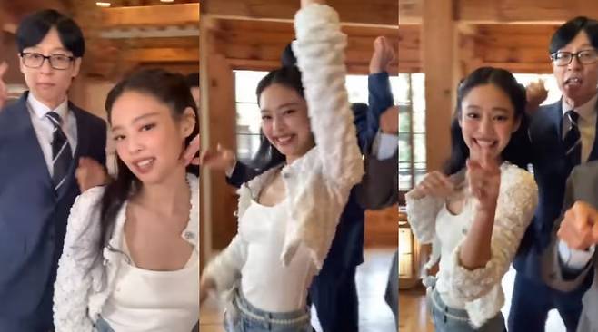 영상에는 제니가 유재석, 조세호와 함께 솔로 1집 '루비' 타이틀곡 'like JENNIE' 챌린지를 하는 모습이 담겼다.