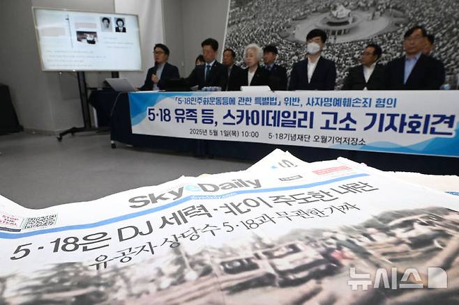[광주=뉴시스] 이영주 기자 = 1일 오전 5·18기념재단에서 광주시와 5·18기념재단 등이 5·18 왜곡 보도를 일삼아온 스카이데일리를 고소할 방침을 밝히는 기자회견을 열고 있다. 2025.05.01. leeyj2578@newsis.com