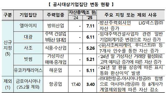 올해 자산 5조 원을 넘겨 신규 지정된 공시대상기업집단은 △LIG △대광 △사조 △빗썸 △유코카캐리어스 등 4개다.