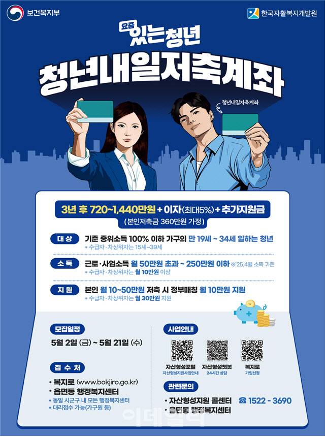 보건복지부는 2일부터 21일까지 ‘청년내일저축계좌’ 2025년 신규 가입자를 모집한다고 밝혔다.